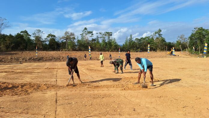 Semangat para warga bersama Satgas TMMD bergotong royong membersihkan lapangan serta memasang tiang panjat pinang, tiang net voli dan penyiapan lomba lainnya.