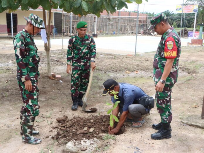 BANYUASIN – Anggota Satuan Tugas (Satgas) TNI Manunggal Membangun Desa (TMMD) ke-127 Kodim 0430/BA bersama masyarakat Desa Wonosari, Kecamatan Pulau Rimau, Kabupaten Banyuasin, melakukan penanaman pohon di beberapa titik di desa tersebut. Kegiatan ini bertujuan untuk mencegah erosi, menjaga kualitas udara, dan meningkatkan kesadaran masyarakat akan pentingnya kelestarian lingkungan.