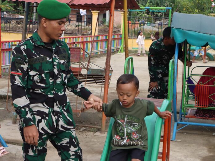 BANYUASIN – Kedekatan anggota Satuan Tugas (Satgas) TNI Manunggal Membangun Desa (TMMD) ke-127 Kodim 0430/Banyuasin (BA) dengan anak-anak di titik sasaran TMMD semakin terlihat nyata. Kehadiran anggota Satgas TMMD tidak hanya dirasakan dalam pembangunan fisik, tetapi juga dalam menciptakan suasana ceria dan keakraban dengan anak-anak.