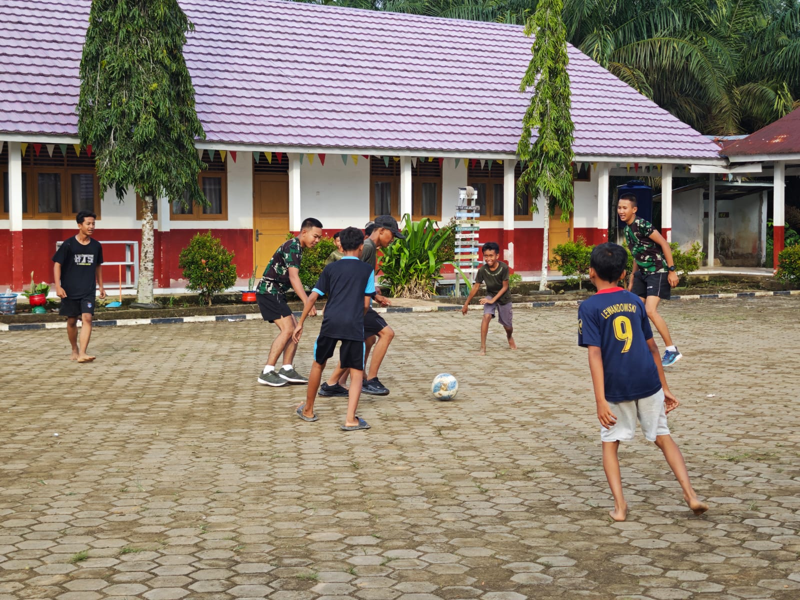 BANYUASIN – Anggota Satuan Tugas (Satgas) TNI Manunggal Membangun Desa (TMMD) ke-127 memanfaatkan waktu senggang untuk menjalin keakraban dengan anak-anak dan remaja Desa Wonosari, Kecamatan Pulau Rimau. Salah satu kegiatan yang dilakukan adalah bermain sepak bola bersama.
