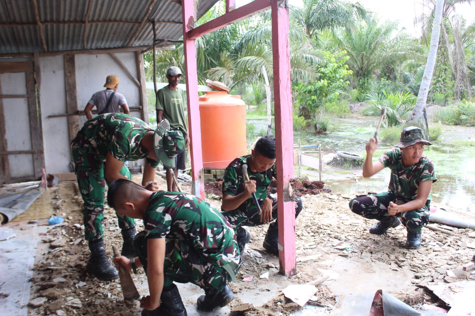 Dengan semangat gotong royong, anggota Satgas TMMD dan masyarakat setempat bahu-membahu membongkar bagian-bagian rumah yang sudah rusak dan menggali pondasi untuk bangunan baru.