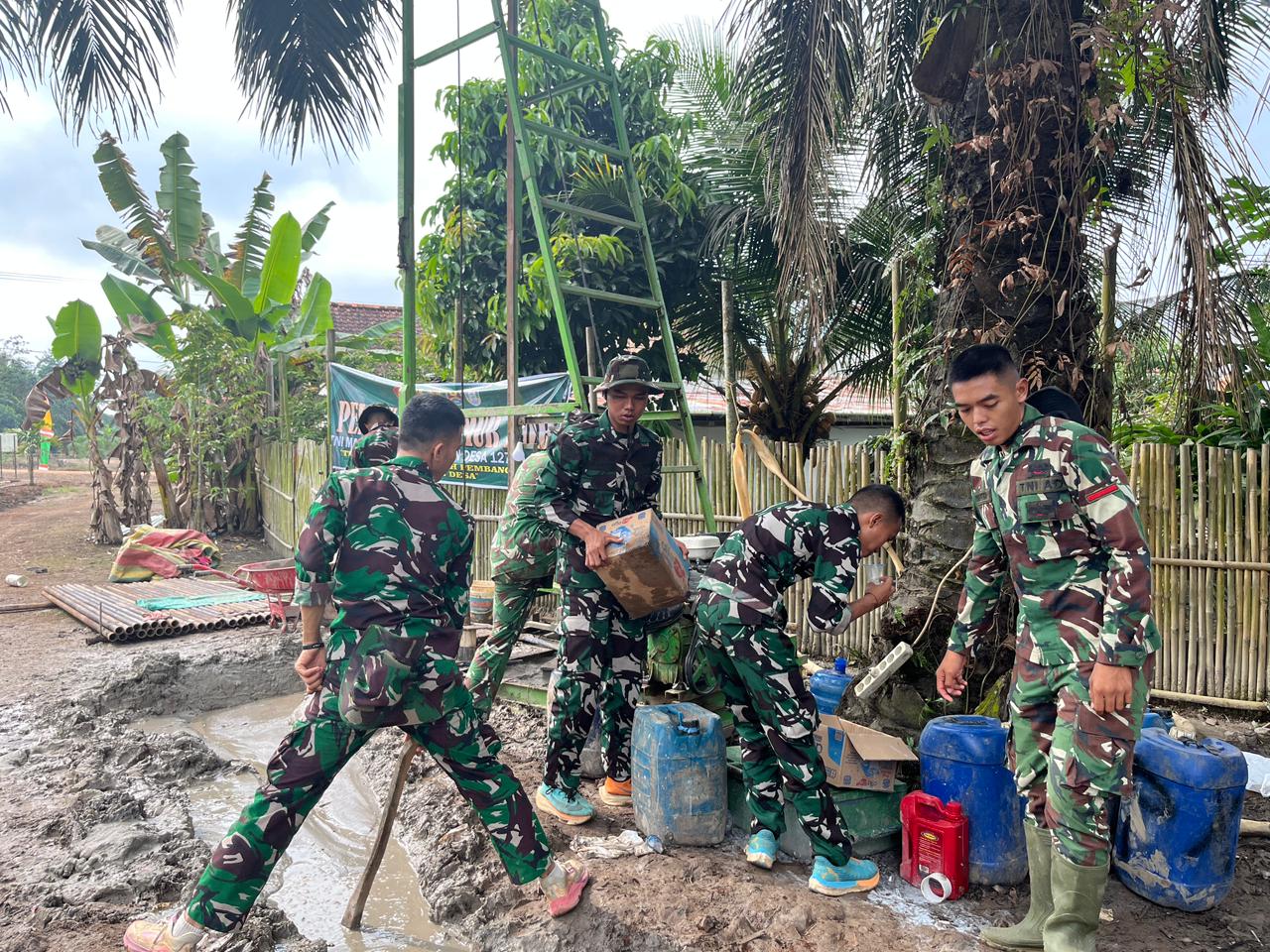 Dengan semangat gotong royong, anggota Satgas TMMD dan warga bahu-membahu menyelesaikan berbagai pekerjaan, mulai dari penggalian, pemasangan pipa, hingga penyelesaian konstruksi sumur bor.. Anggota Satgas TMMD dan warga bekerja keras meskipun menghadapi kendala berupa kondisi tanah yang berlumpur.