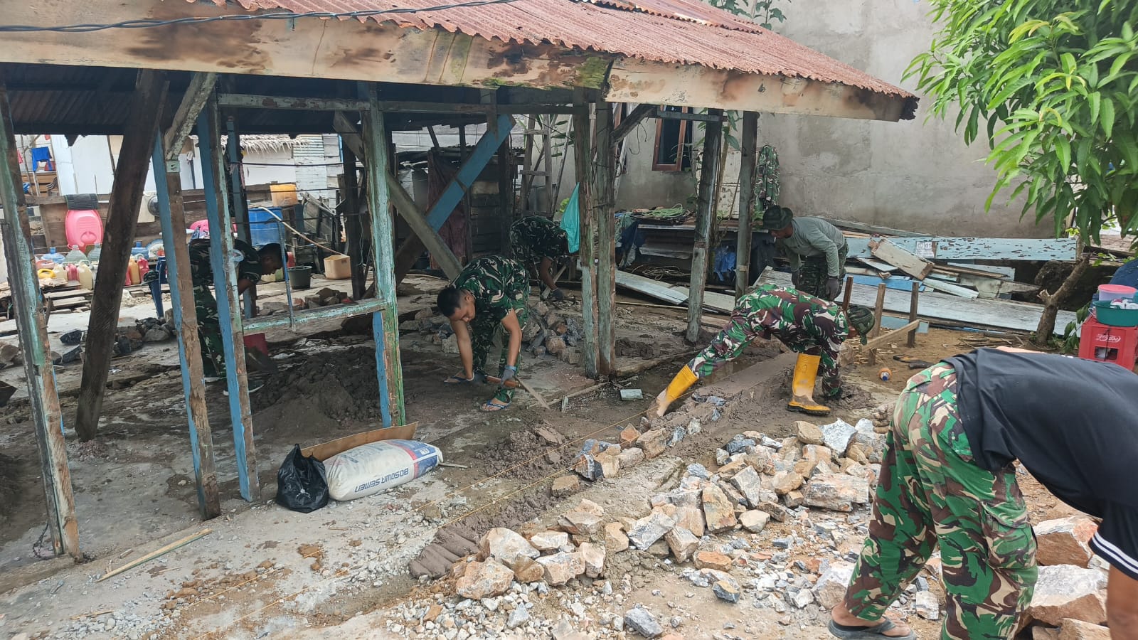 Personel Satgas dan masyarakat setempat terpantau bahu-membahu melanjutkan tahap penggalian serta pemasangan pondasi untuk program Renovasi Rumah Tidak Layak Huni (RTLH).