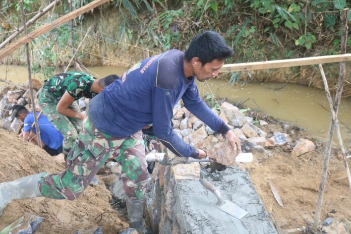 Mengandalkan kerja sama tim yang solid, para prajurit bersama warga setempat bahu-membahu melansir material batu menggunakan gerobak dorong di medan yang cukup menantang.