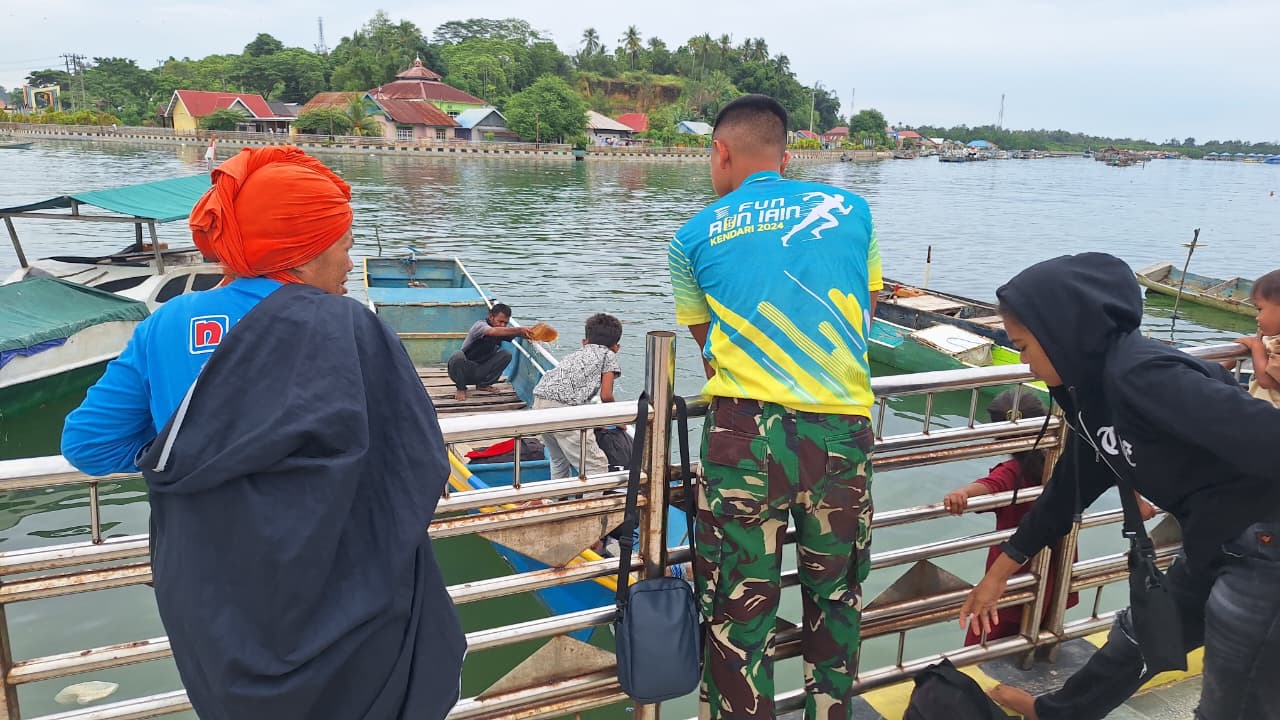 Di sela-sela kesibukan pengerjaan infrastruktur, para anggota TNI dengan sigap membantu warga, termasuk anak sekolah dan lansia, saat hendak menaiki perahu di Kelurahan Petoaha, Kota Kendari, Senin (23/2).
