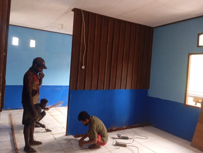 Mappi – Rumah milik Bapak Yohanis Boskow Avu di Kampung Yibin menunjukkan progres yang cukup signifikan. Pada hari ke-27 pelaksanaan TMMD, pekerjaan utama yang dilakukan meliputi pemasangan pintu, cendela, serta pemasangan keramik di teras depan rumah. Pekerjaan ini sedang berlangsung secara bersamaan untuk mempercepat proses pembangunan.