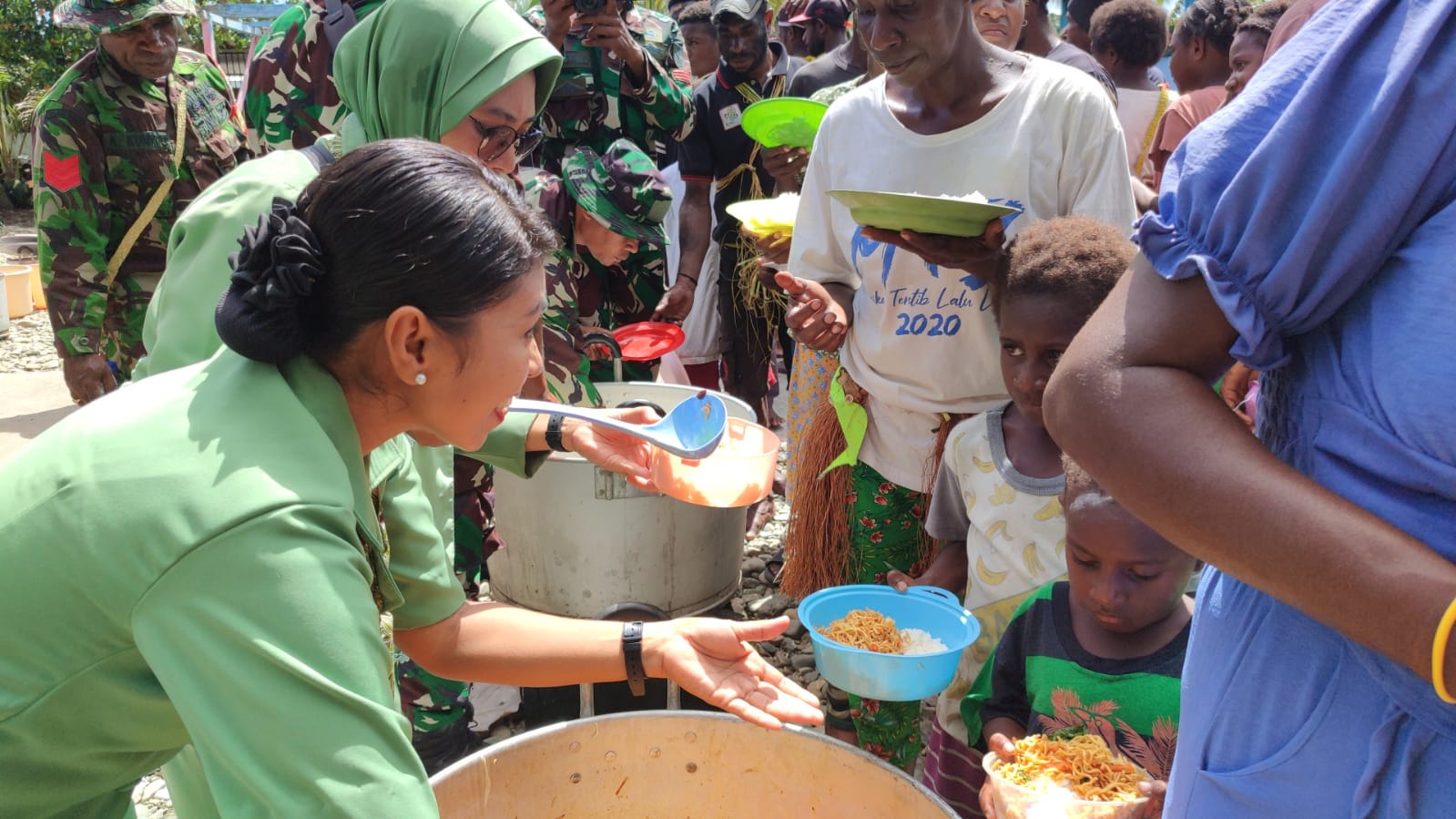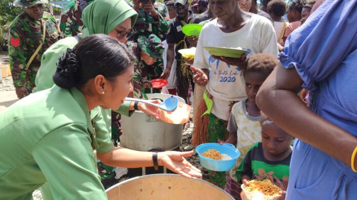 MIMIKA – Satgas TMMD Ke-124 Kodim 1710/Mimika menggelar acara santap sehat yang tak hanya mengisi perut, tetapi juga menyatukan hati. Acara ini diadakan dalam rangka pembukaan TMMD ke-124 Kodim 1710/Mimika yang dilaksanakan di Kampung Pigapu. Tidak seperti acara masak biasa, kali ini yang memasak adalah para prajurit TNI yang tergabung dalam Satgas TMMD Kodim 1710/Mimika bersama ibu-ibu Persit KCK Cabang XXXV yang ikut ambil bagian dalam acara santap sehat tersebut.