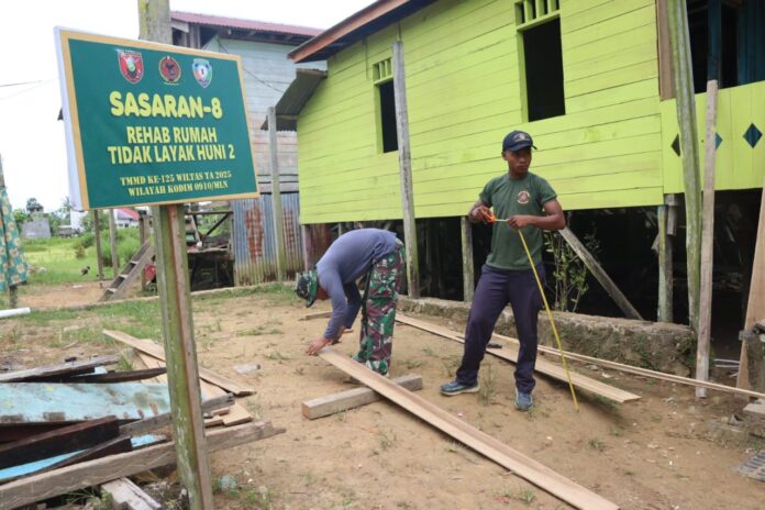 MALINAU – Satgas TMMD Ke-125 Wiltas Kodim 0910/Malinau terus bergerak cepat dalam menyelesaikan pembangunan Rumah Tidak Layak Huni (RTLH) yang menjadi salah satu sasaran fisik utama dalam program TMMD di Desa Tanjung Lapang, Kecamatan Malinau Barat, Kabupaten Malinau, Senin (4/8/2025)