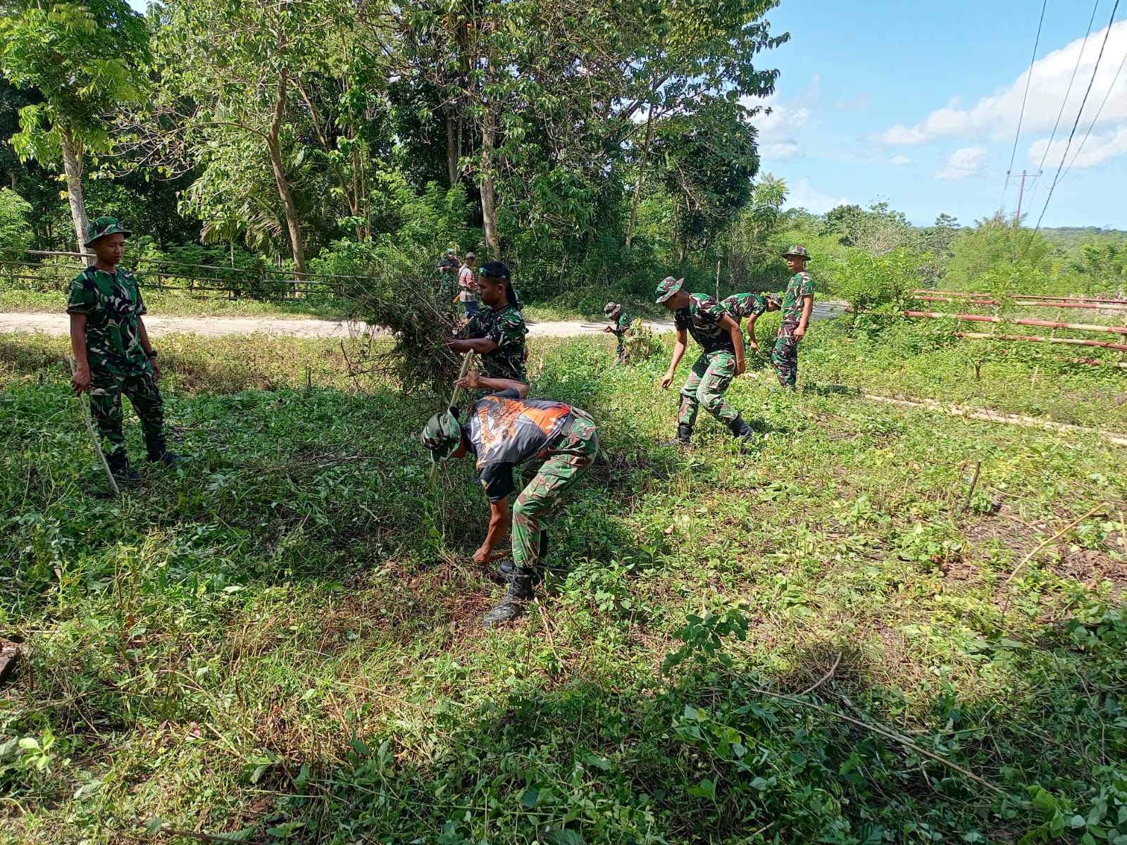 Terlihat semangat gotong royong antara TNI dan masyarakat dalam menyiapkan lahan, mulai dari pemotongan semak belukar hingga perataan area.