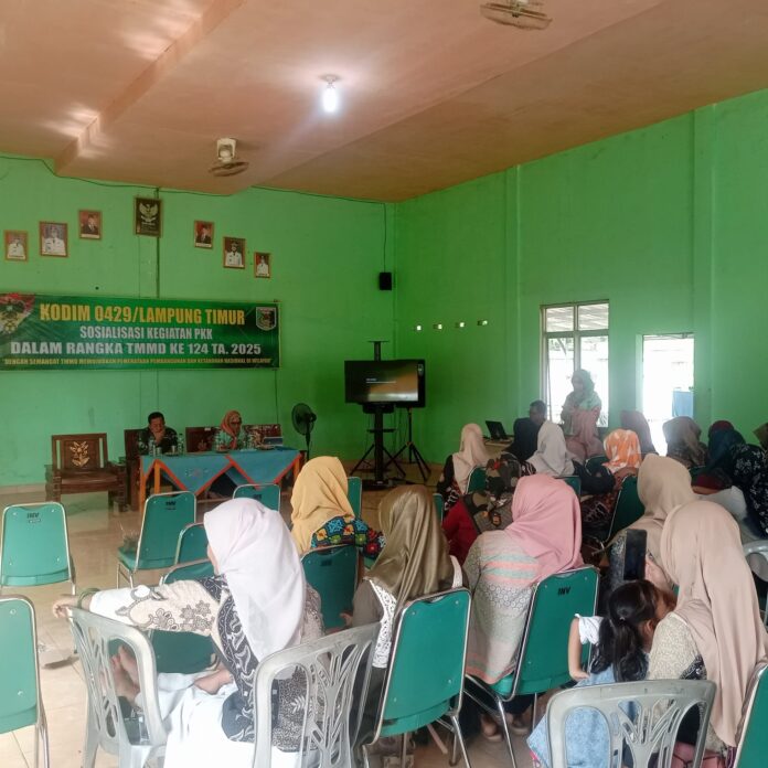 LAMTIM – Satuan Tugas (Satgas) TMMD ke-124 Kodim 0429/Lamtim kembali menggelar sasaran program non fisik sosialisasi Pemberdayaan Kesejahteraan Keluarga (PKK), di Balai Desa Itik Rendai, Kecamatan Melinting, Kamis (22/5/2025).