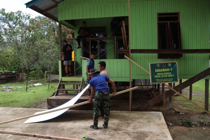 MALINAU, Satgas TNI Manunggal Membangun Desa (TMMD) ke-125 Tahun 2025 Wilayah Perbatasan (Wiltas) Kodim 0910/Malinau terus menunjukkan komitmennya dalam mewujudkan hunian layak bagi warga Desa Tanjung Lapang. Hari ini, personel satgas bersama warga bergotong royong memasang plafon pada salah satu Rumah Tidak Layak Huni (RTLH) yang sedang direnovasi, bertempat di Rumah ibu julianten RT.13, Desa Tanjung Lapang, Kecamatan Malinau Barat, Kabupaten Malinau, Senin (11/8/2025).