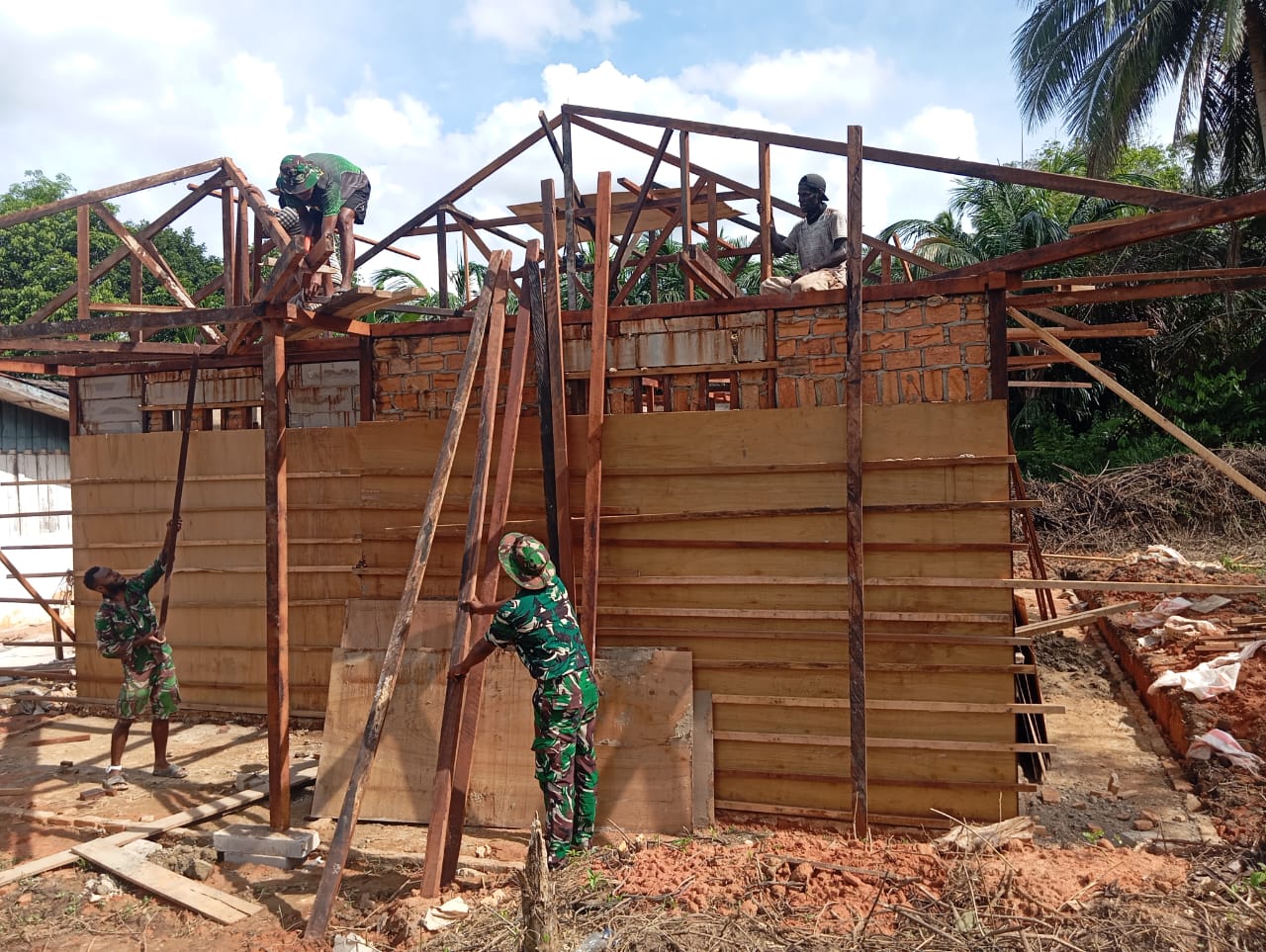 Satgas TMMD dengan cekatan memasang kap rumah di bagian atas bangunan, sementara yang lain terlihat sedang mengaplikasikan plester pada dinding bagian dalam rumah. Dinding bagian bawah sudah tertutup rapih dengan papan. Pemandangan ini menunjukkan sinergi yang kuat antara TNI dan masyarakat dalam mewujudkan impian Bapak Fransiskus untuk memiliki hunian yang layak.