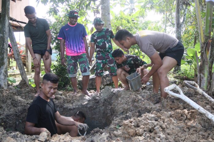 Proses pembangunan MCK ini dilakukan di lokasi yang cukup menantang, dengan kondisi tanah yang berlumpur dan licin akibat hujan. Namun hal itu tidak menyurutkan semangat para personel Satgas. Mereka justru tampak menikmati prosesnya, bahkan sesekali terlihat bercanda sambil tubuh mereka dipenuhi lumpur.
