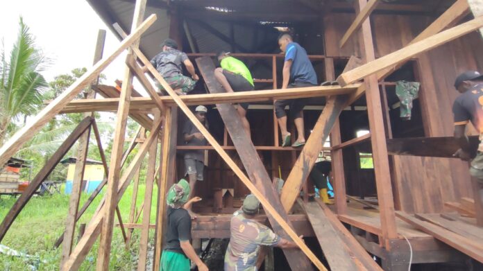 Mimika – Pekerjaan fisik program TNI Manunggal Membangun Desa (TMMD) ke-124 terus dikebut. Salah satu kegiatan yang menjadi prioritas adalah pemasangan dinding rumah warga di sasaran 1 milik Bapak Henrikus, yang hingga hari ini terus berlanjut. Sasaran tersebut berlokasi di Kampung Pigapu, Kabupaten Mimika.
