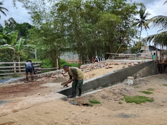 Di bawah terik matahari, para prajurit bersama warga setempat bahu-membahu meratakan adukan semen, menunjukkan semangat gotong royong yang menjadi ciri khas dari program kemanunggalan ini.