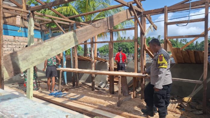 Tanpa sekat, aparat berseragam loreng dan cokelat ini menunjukkan sinergitas tanpa batas dalam mempercepat pembangunan rumah layak huni (RTLH).