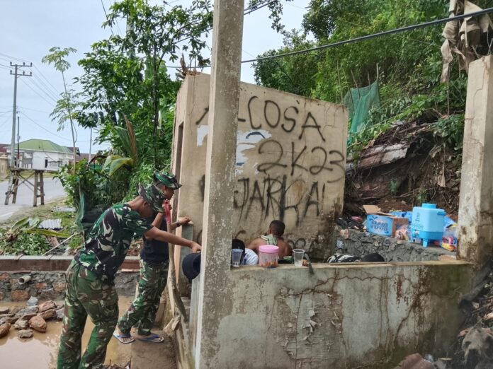 Kendari — Satuan Tugas TNI Manunggal Membangun Desa (TMMD) ke-127 Kodim 1417/Kendari mulai melakukan pembongkaran lantai dasar fasilitas Mandi, Cuci, Kakus (MCK) di Kelurahan Sambuli, Kecamatan Nambo, Kota Kendari, pada Kamis (12/2).