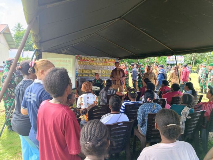 SORONG – Satgas TMMD Ke-124 Kodim 1802/Sorong terus melakukan upaya pemberdayaan dan penyuluhan kepada masyarakat setempat. Salah satu program unggulan yang mereka lakukan adalah memberi penyuluhan wawasan kebangsaan (Wasbang) kepada masyarakat Di kampung yeflio distrik mayamuk kabupaten sorong. Provinsi papua barat daya. Senin (12/05/2025).