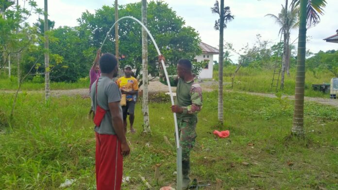 Mimika – Anggota Satgas TNI Manunggal Membangun Desa (TMMD) ke-124 Kodim 1710/Mimika mulai melakukan pemasangan instalasi pipa air untuk fasilitas sumur bor di Kampung Iwaka, Distrik Iwaka, Kabupaten Mimika, Minggu (18/05/2025).