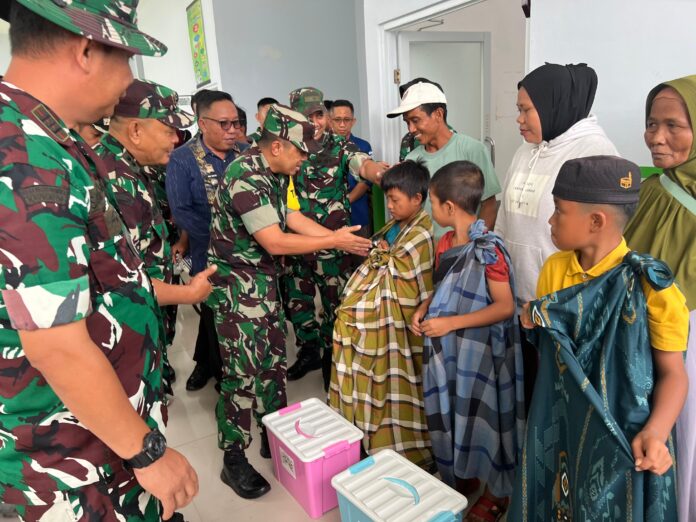 Konawe – Kolonel Arm Djoko Sudjarwo (Katim Wasev) menjalin kedekatan bersama masyarakat dan anak-anak pada pelaksanaan kegiatan sunat masal, di Kec. Asinua, Kab. Konawe, Sabtu (9/8).