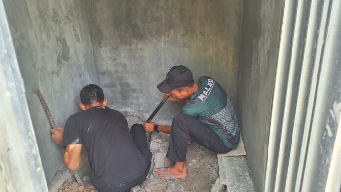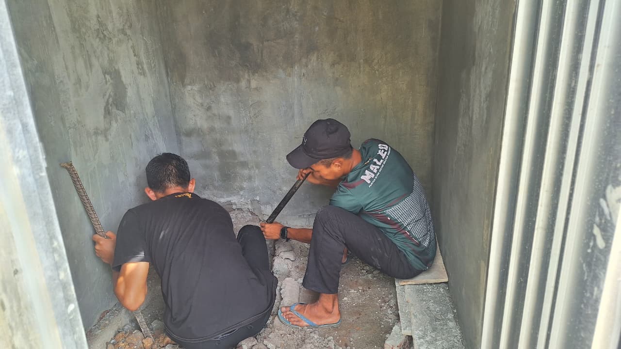 Pengerjaan MCK memasuki tahap Plaster dinding dan penggalian lubang closed yang terus dikerjakan oleh anggota Satgas TMMD bersama masyarakat Desa.
