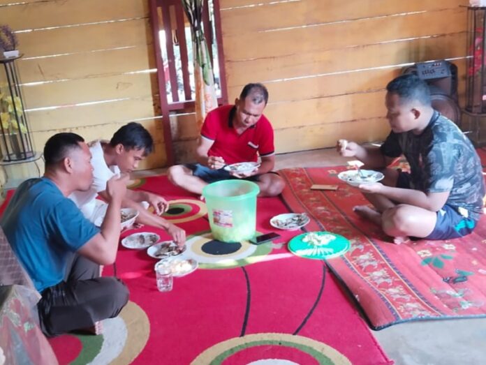 Konawe – Usai melaksanakan pengerjaan sasaran fisik, anggota Satgas TMMD 125 Kodim 1417/Kendari kembali mengisi tenaga dengan makan siang bersama masyarakat, di Garuda, Kec. Padangguni, Kab. Konawe, Sabtu (26/7).