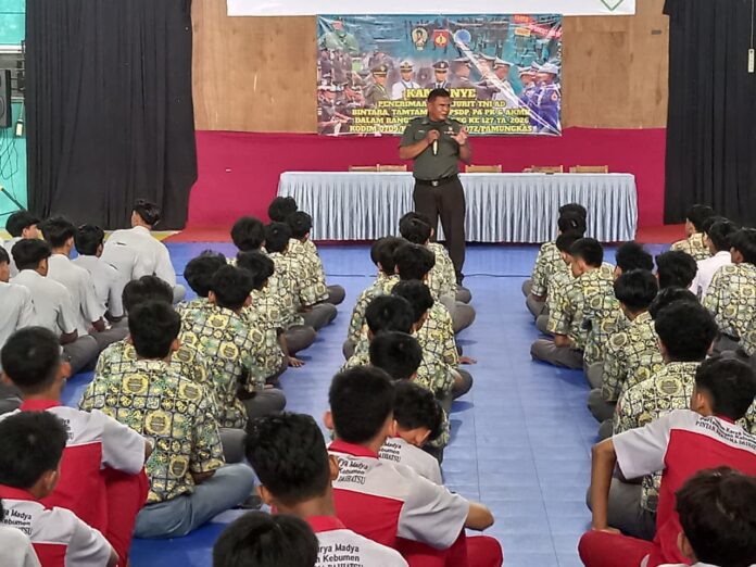 Kebumen – Dalam rangka menumbuhkan semangat bela negara dan pengabdian kepada bangsa, TMMD Reguler ke-127 Kodim 0709/Kebumen menggelar kegiatan Sosialisasi Rekrutmen TNI AD Tahun Anggaran 2026 bersama Ajenrem 072/Pamungkas. Kegiatan tersebut dilaksanakan di Aula SMA Negeri 1 Kebumen, Kamis (12/02/2026), dan diikuti oleh sekitar 350 siswa-siswi kelas XII.