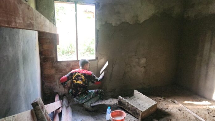 SORONG – Anggota Satgas TMMD Ke – 124 Kodim 1802/Sorong kerjakan sasaran fisik perehaban RTLH rumah milik keluarga Rahel Kalawen dalam tahap pelester dinding di Kampung Yeflio Distrik Mayamuk Kabupaten Sorong. Senin (19/05/2025).