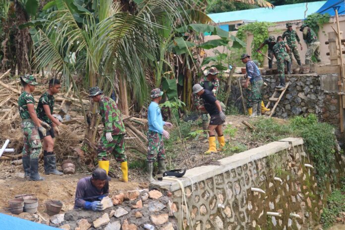 Para personel TNI bersama warga setempat tampak bahu-membahu menyusun material batu dan semen guna memastikan struktur bangunan kokoh untuk mengantisipasi terjadinya abrasi dan tanah longsor di area tersebut.