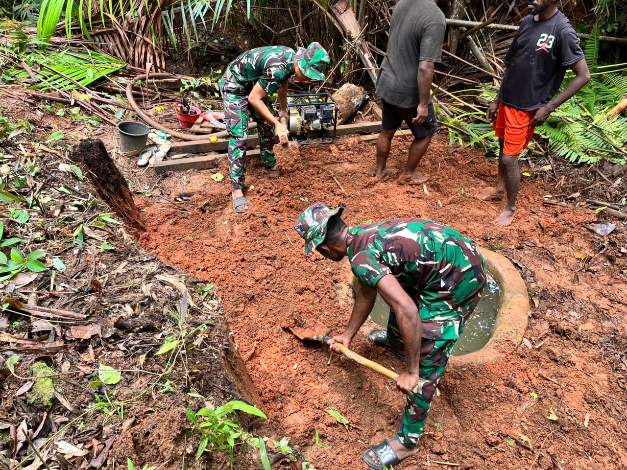 Mappi – Satgas TMMD (TNI Manunggal Membangun Desa) ke-127 Kodim 1704/Mappi terus berupaya meningkatkan kesejahteraan masyarakat Kampung Yibin, Distrik Venaha, Kabupaten Mappi, salah satunya melalui program penyediaan air bersih. Pada hari ke-12 pelaksanaan TMMD, Sabtu (21/2/2026), Satgas fokus pada pengecoran rabat sumur air bersih di RT.02, yang merupakan sumber air utama bagi masyarakat setempat.
