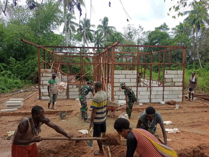 Mappi – Semangat gotong royong terus membara dalam pelaksanaan TMMD (TNI Manunggal Membangun Desa) ke-127 di Kampung Yibin, Distrik Venaha, Kabupaten Mappi. Satgas Kodim 1704/Mappi bersama warga setempat bahu membahu menyelesaikan pembangunan 3 unit rumah layak huni bagi masyarakat yang membutuhkan.Sabtu (21/2).