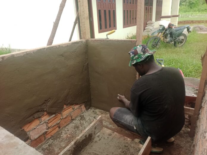 Mappi – Satgas TMMD (TNI Manunggal Membangun Desa) ke-127 Kodim 1704/Mappi terus memacu pembangunan Mandi Cuci Kakus (MCK) di belakang Gereja St. Paulus Yibin, Distrik Venaha, Kabupaten Mappi, Provinsi Papua Selatan. Pada hari ke-9 pelaksanaan TMMD, Rabu, 18 Februari 2026, kegiatan difokuskan pada plester dinding MCK.