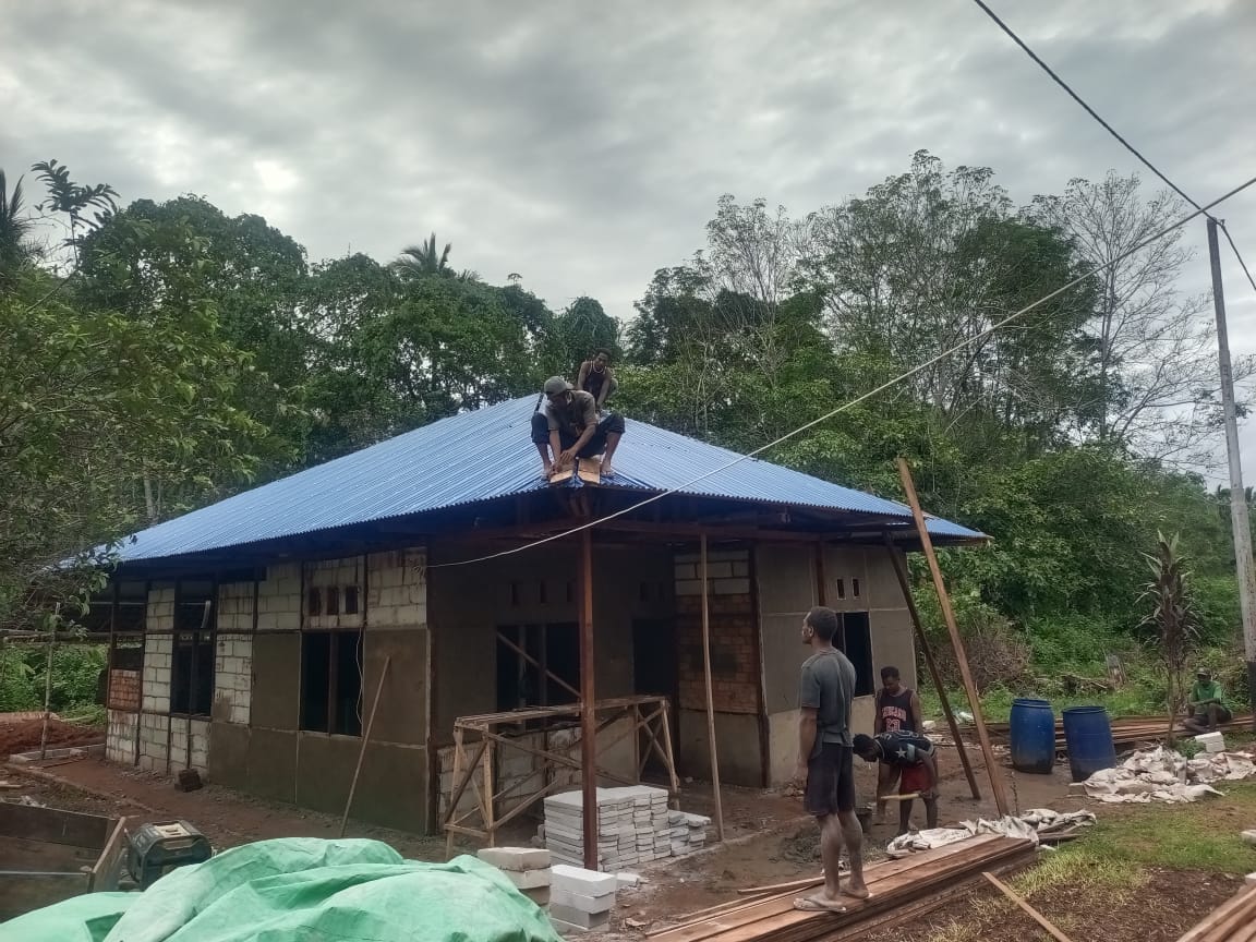 Meskipun cuaca di wilayah Kp. Yibin pada pagi hari diguyur hujan, namun tidak menyurutkan semangat Satgas TMMD dan warga setempat untuk terus bekerja. Pemasangan seng dilakukan dengan hati-hati dan teliti, memastikan atap rumah dapat melindungi keluarga Bapak Fransiskus dari panas dan hujan. Sementara itu, plester dinding dalam rumah juga terus dikerjakan, meratakan permukaan dinding dan memberikan tampilan yang lebih rapi dan nyaman.