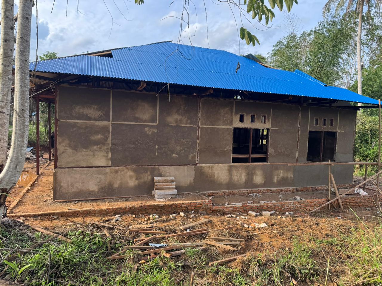 Pemasangan seng dilakukan dengan rapi, memberikan tampilan atap yang elegan dan modern. Sementara itu, pemasangan batu dan plester dinding terus dikerjakan untuk memberikan sentuhan akhir yang mempercantik tampilan rumah.
