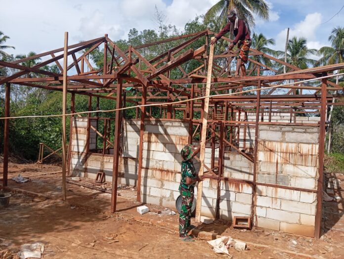rangka atap rumah sudah berdiri kokoh. Satgas bersama warga mulai memasang balok kayu di bagian atas rangka. Dinding rumah yang terbuat dari batako juga sudah terlihat berdiri, menandakan bahwa pembangunan rumah sudah memasuki tahap akhir.