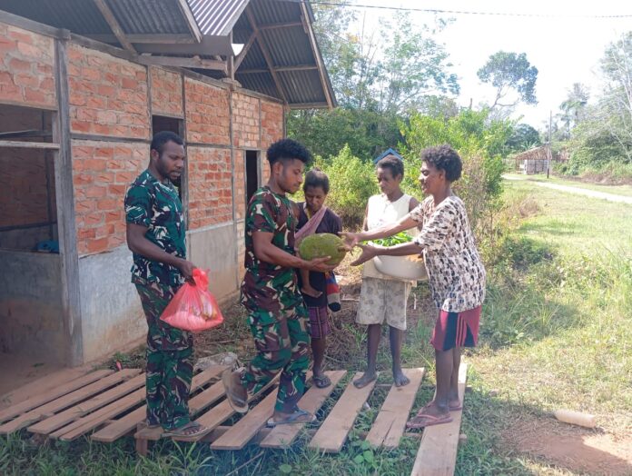 Mappi – Semangat gotong royong dan kebersamaan mewarnai pelaksanaan TMMD (TNI Manunggal Membangun Desa) ke-127 Kodim 1704/Mappi di Kampung Yibin, Distrik Venaha, Kabupaten Mappi. Bukan hanya kaum laki-laki dewasa yang bahu membahu membantu pekerjaan fisik, tetapi juga kaum mama-mama kampung yang dengan tulus memberikan sumbangsih berupa sayuran dan rica/cabe kepada personel TMMD 127 Kodim 1704/Mappi.