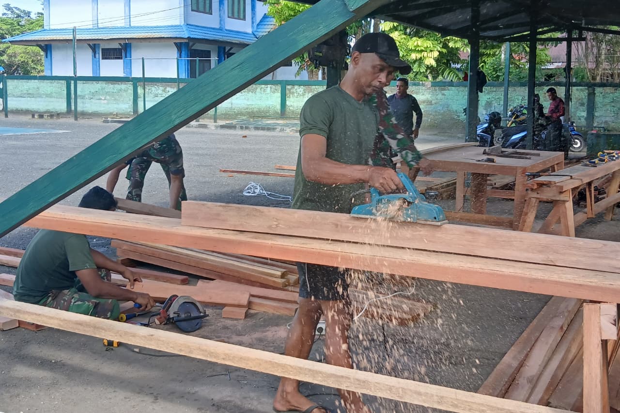 Kegiatan pembuatan kusen tersebut dilaksanakan di halaman Markas Komando Rayon Militer (Makoramil) 1708/BN, yang terletak di Jalan Sriwijaya, Distrik Samofa, Kabupaten Biak Numfor, pada Senin (27/4/2026).