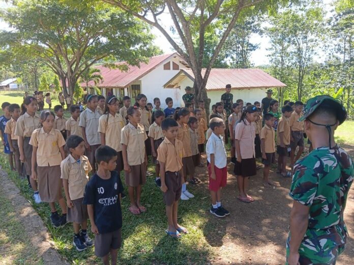 Sumba Barat Daya – Anggota Satgas TMMD Ke-128 Kodim 1629/Sumba Barat Daya terus menunjukkan kepeduliannya terhadap pembinaan generasi muda melalui kegiatan non-fisik. Salah satunya dengan memberikan materi Wawasan Kebangsaan (Wasbang) serta melatihkan Peraturan Baris Berbaris (PBB) kepada siswa SD dan SMP Ate Engge di Desa Umbu Wangu, Kecamatan Wewewa Selatan, Senin (27/04/2026).
