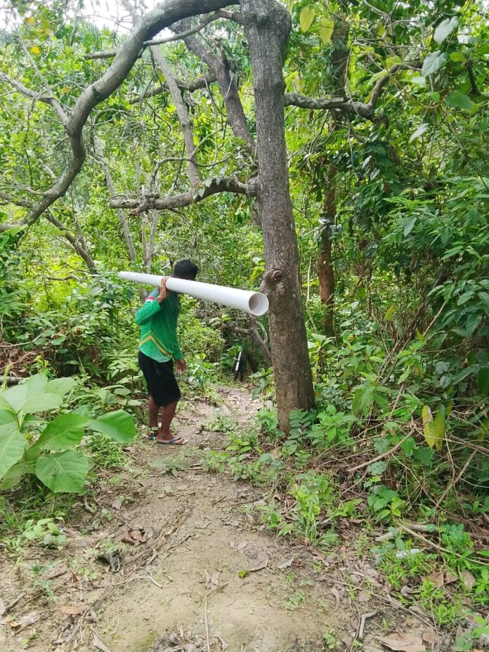 Pada Selasa (10/3), sejumlah personel TNI bersama warga setempat bahu-membahu melakukan pemasangan pipa induk yang menghubungkan bak penampungan air menuju pemukiman.
