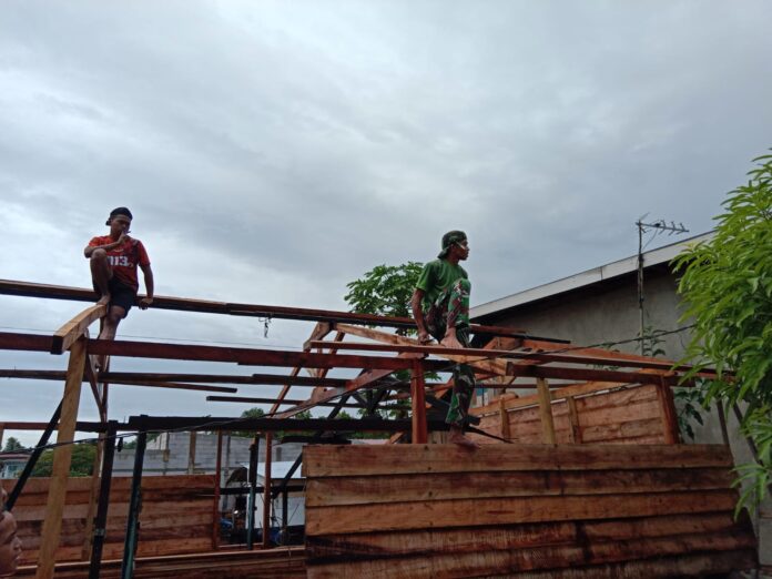 Pada Minggu (1/3), para prajurit bersama warga terpantau bahu-membahu melaksanakan pemasangan kerangka bagian atas dan gorden pada sasaran fisik ke-4.